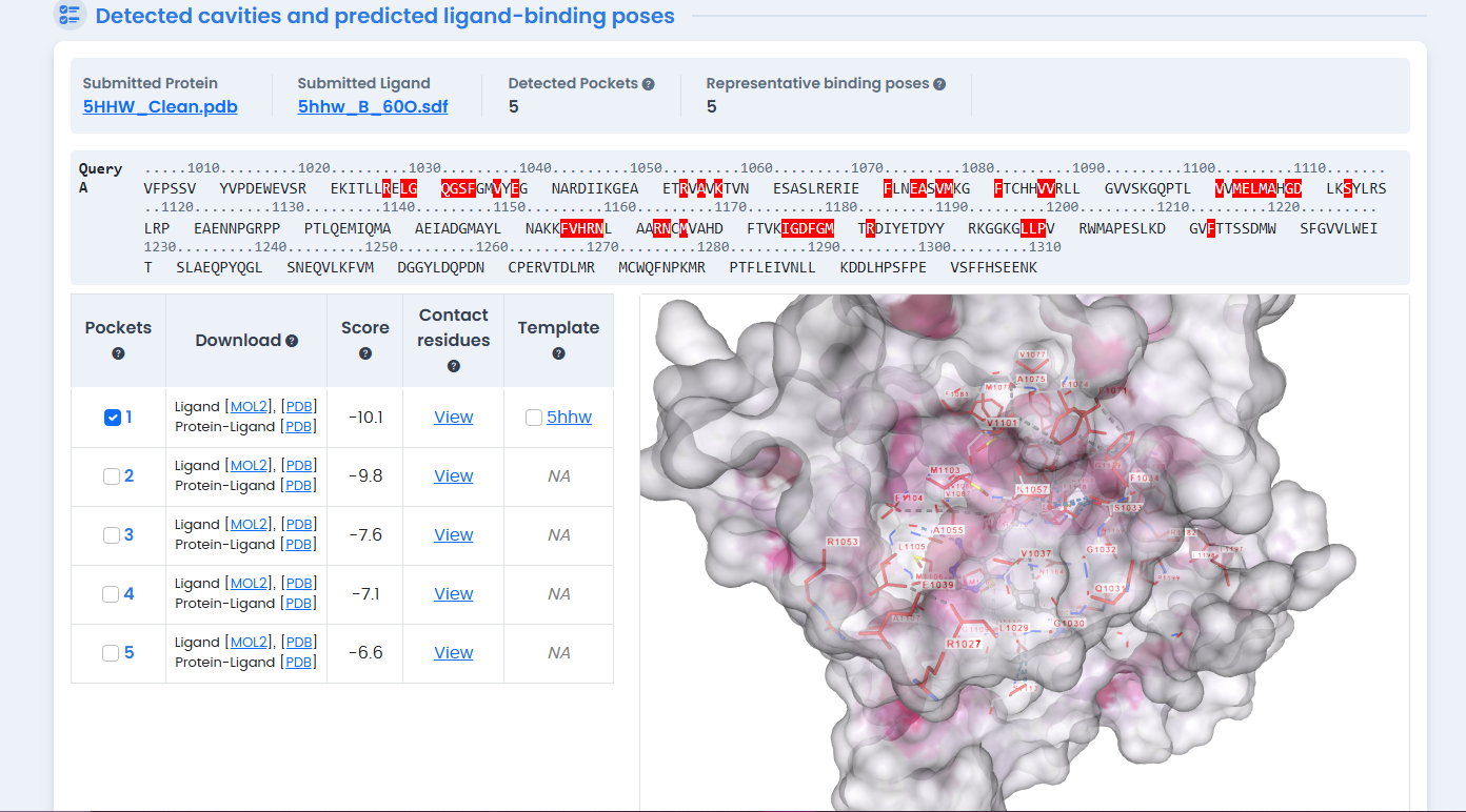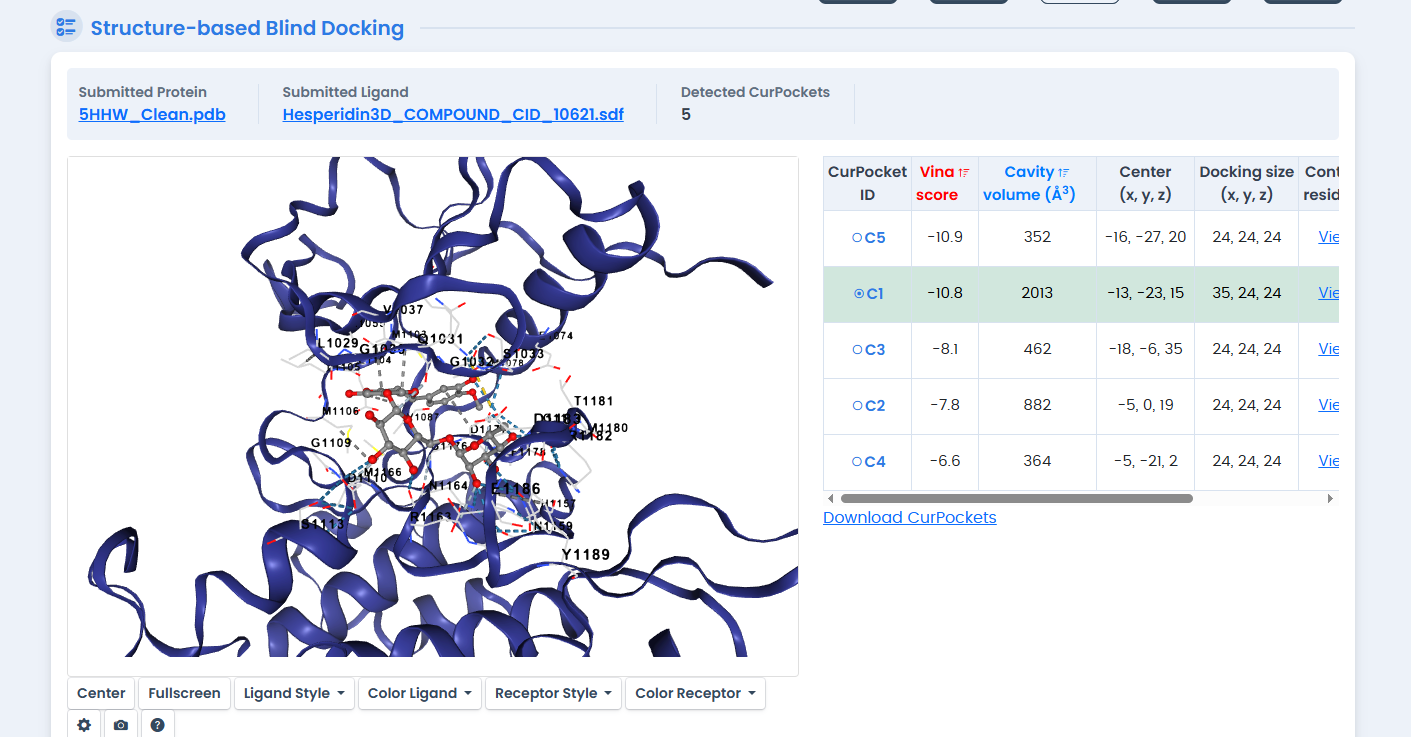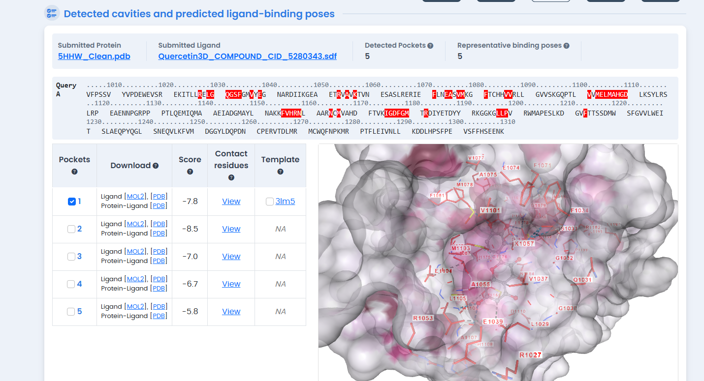 Figure 2: CB-Dock2 blind docking cavity detection on the 5HHW structure. The server automatically identified five potential binding pockets, with the largest cavity (2013 ų) corresponding to the ATP-binding site used for subsequent phytochemical screening.