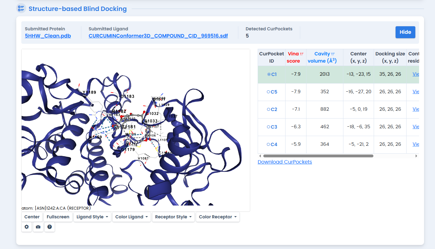 Figure 5: Curcumin docking results showing binding pose within the 5HHW ATP-binding site. Curcumin achieved a Vina score of -7.9 kcal/mol, ranking fourth among the phytochemical candidates.