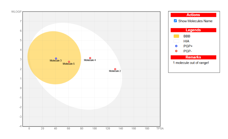 Figure 8: SwissADME Boiled-Egg plot predicting gastrointestinal absorption and blood-brain barrier permeation. Compounds in the white region show high GI absorption; those in the yellow "yolk" can penetrate the BBB. Hesperidin falls outside both regions, indicating poor passive permeability.