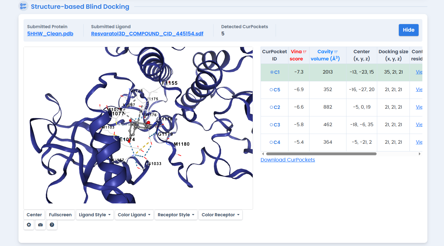 With structural templates validated, we turned to molecular docking to identify potential inhibitors. The CB-Dock2 server combines curvature-based cavity detection (CurPocket) with AutoDock Vina scoring.14