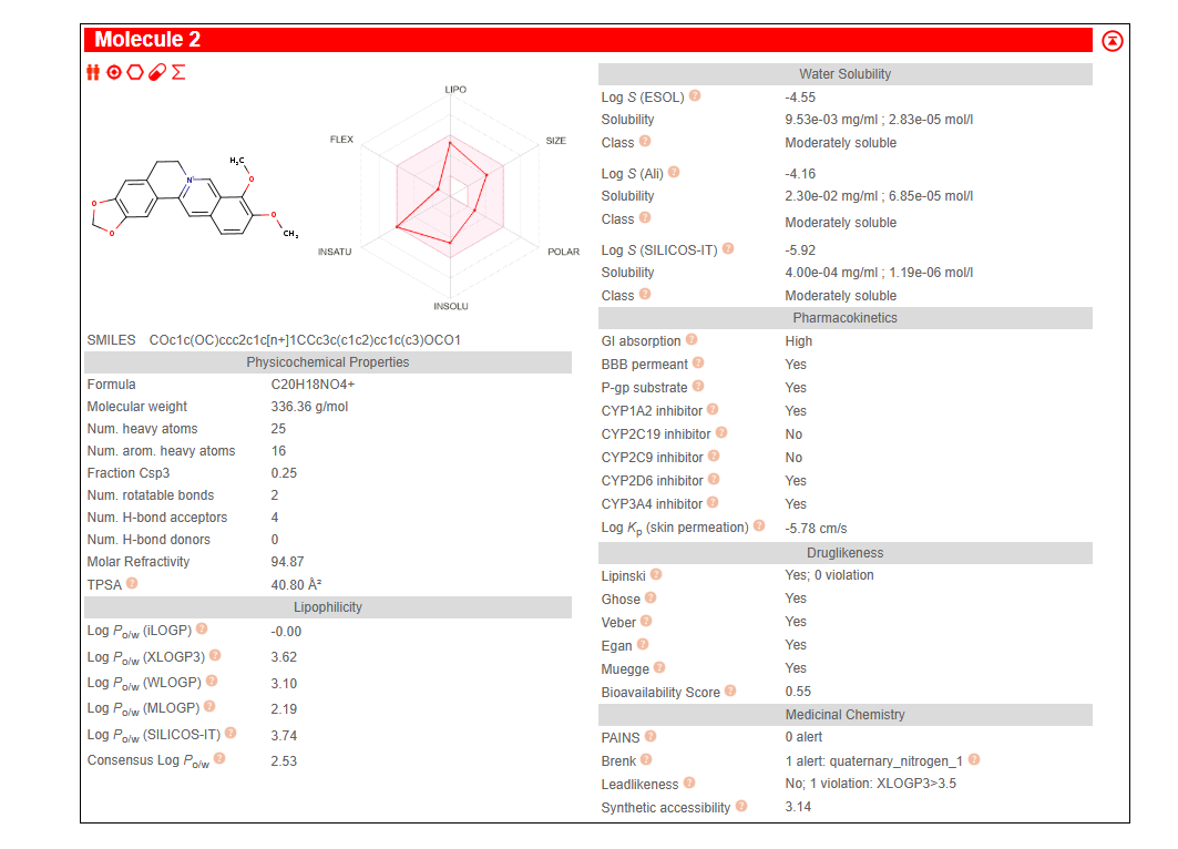 Figure 10: SwissADME pharmacokinetic and drug-likeness profile for Berberine. The compound shows zero Lipinski violations, high gastrointestinal absorption, blood-brain barrier permeability, and a bioavailability score of 0.55—properties that make it an attractive candidate for further development.
